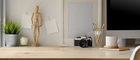 Close up view of study table with copy space, camera, books, stationery decorations in home office room