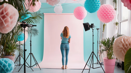A woman stands in a photo studio with a pink backdrop, surrounded by lighting equipment and decorations.