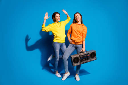 Let's get it started. Full body photo of two ladies carry vintage tape, recorder students party chill wear casual orange yellow hoodies isolated blue color background
