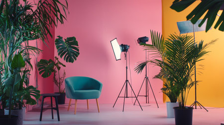 A modern studio setup featuring tropical plants, bold colors, and a creative ambiance illuminated by natural light.
