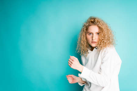 Beautiful woman stands sideways on a blue background clenching her hands into fists