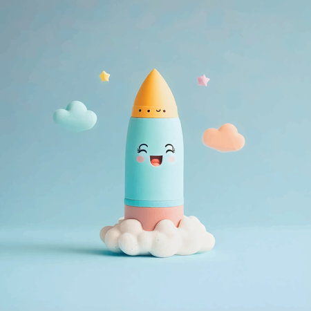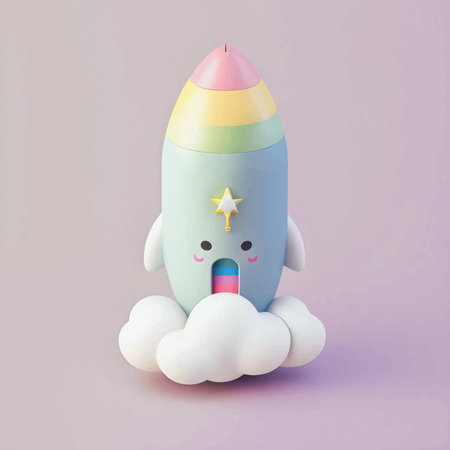 A small red and white rocket is taking off surrounded by colorful spheres on a playful surface.