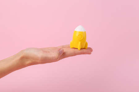 Toy rocket, space shuttle on the palm of your hand. pink background. Startup, fresh idea Corncept