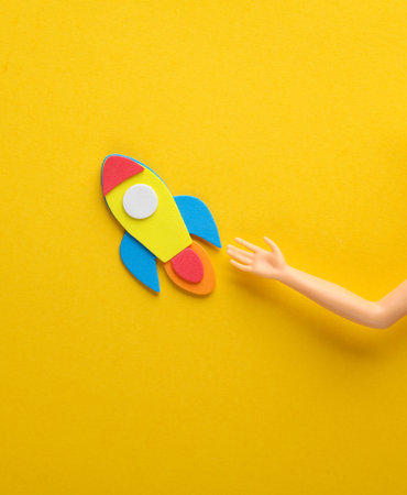 Hand doll with space rocket on a yellow background. startup concept
