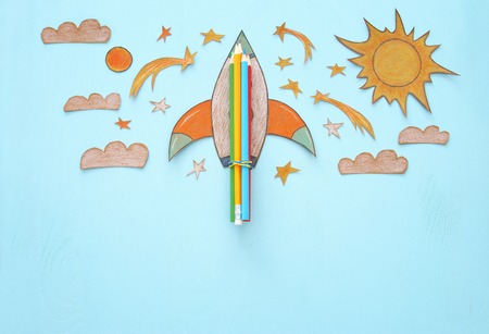 Back to school banner. rocket cut from paper and painted over wooden blue background