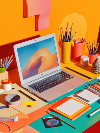 A bright workspace features a laptop surrounded by various art supplies, pens, and colorful sheets, inspiring creativity and productivity.