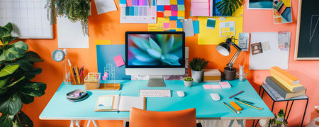 A creative freelancer s colorful desk with mood boards, design tools, and a stylish ergonomic chair