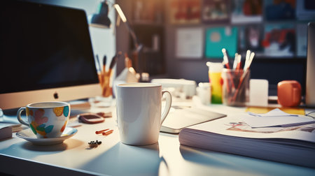 A well-organized desk with laptop, stationery, and a cup of coffee under sunlight. Generate AI