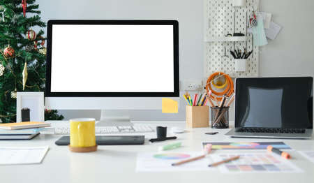 Modern workspace with computer with blank screen and equipment on white table.Blank screen for your information.