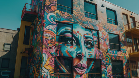 Surreal and vibrant graffiti artwork covering the exterior of a tall urban building Dreamlike and fantastical art style with colorful paint textures and abstract patterns creating a creative