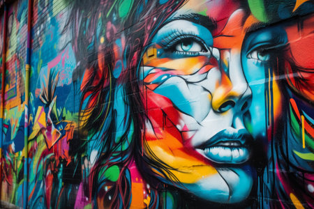 Vibrant street art portrait of a woman with bold colors and intricate details