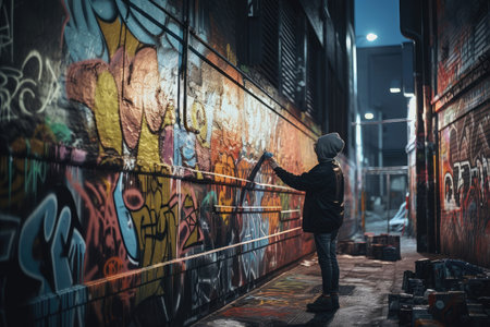 person, making graffiti art on brick wall in dark alleyway, created with generative ai