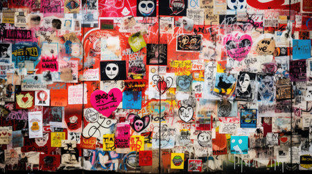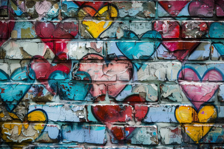 A wall covered in graffiti with many hearts painted on it. The hearts are of different colors and sizes, and they are scattered all over the wall. Scene is one of love and affection