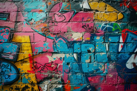 A graffiti-covered urban brick wall, showcasing vibrant street art and textures