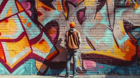 Person in brown jacket and orange hat standing in front of a vibrant graffiti-covered wall.