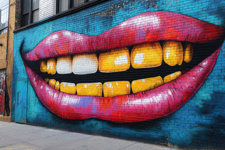 A vibrant mural of smiling teeth on a city wall
