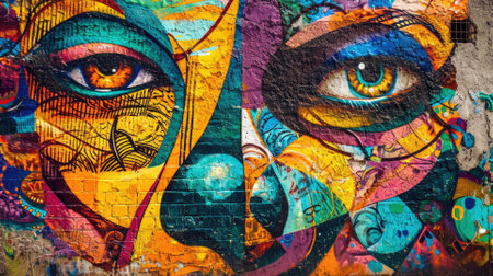 A striking graffiti mural captures the essence of urban art with a bold depiction of colorful, stylized eyes on a city wall. Resplendent.