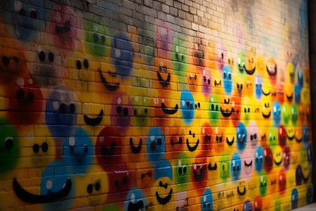 Brick wall with colorful painted smiley faces, street art concept