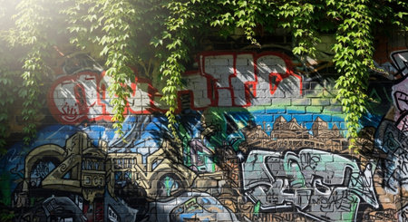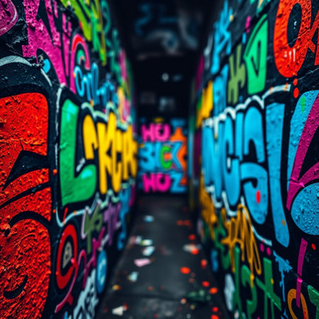 walls adorned with colorful graffiti street art, depicting bold designs and intricate patterns.