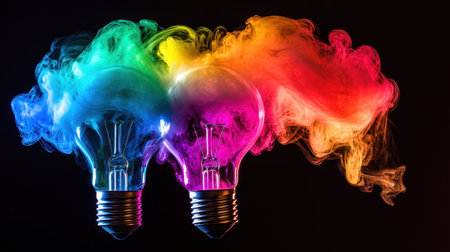 A captivating image featuring two colorful light bulbs emitting vibrant smoke swirls, creating an artistic display of illumination and energy. Perfect for creative projects.