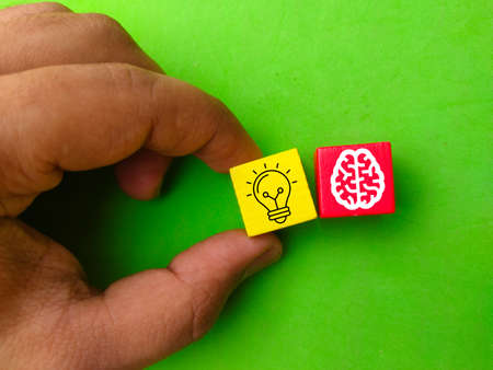 Hand holding colored cubes with bulb and brain icons. the concept of innovation