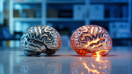 Two metallic brain models, one silver and one glowing orange, sit on a reflective surface.
