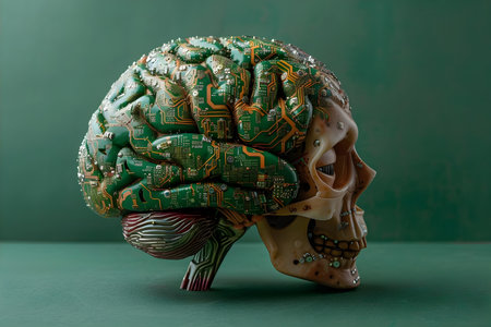 This image features two futuristic brain models set against a vibrant circuit board backdrop, symbolizing the intersection of technology and human cognition.