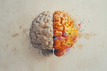 A vivid representation showcases the left side of the brain filled with logical patterns, while the right side bursts with creative colors and forms.