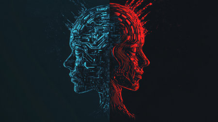 Two humanoid figures in contrasting colors, one blue and digital, the other red and organic, symbolize the interplay between technology and humanity.