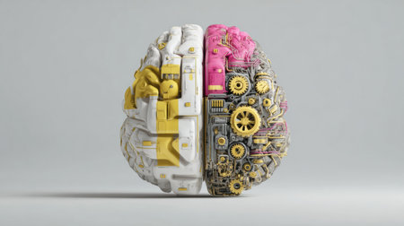 Artistic brain design blending mechanical and colorful segments, highlighting the fusion of human intellect and machine precision.