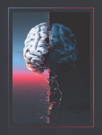 Glitching brain artwork contrasts vivid colors and dark tones, creating a striking visual with an incomplete section, evoking a sense of mystery and intrigue.