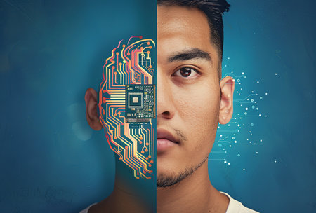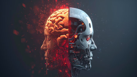 A head outline showcases a blend of organic and mechanical features, highlighting a fusion of human and artificial intelligence in a bold design.