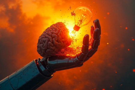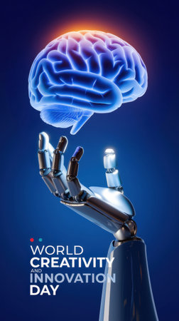 Celebrating World Creativity and Innovation Day, this image features a futuristic robotic hand delicately holding a glowing brain, symbolizing the fusion of technology and human creativity in a vibrant blue background