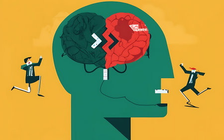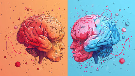 This illustration depicts a brain with interconnected neural networks, featuring blue and red hemispheres