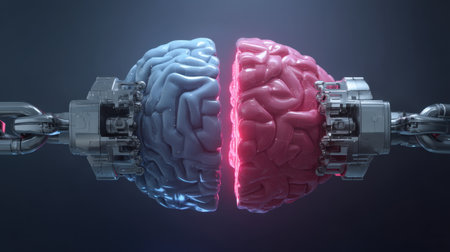 Futuristic representation of split brain, showcasing blue half and red half, connected by mechanical elements. This symbolizes intersection of technology and human cognition, evoking thoughts