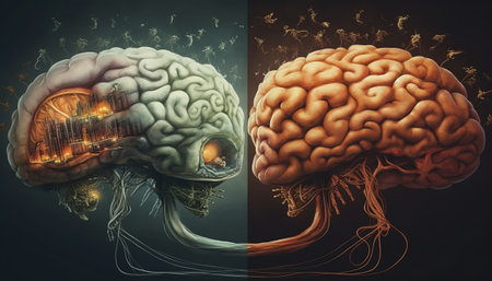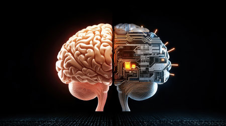 A side-by-side comparison of a human brain and a digital AI brain, showcasing advancements in artificial cognition.