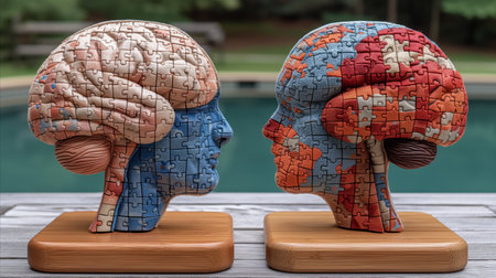Two puzzle art pieces showcasing the heads of two individuals, symbolizing a connection between minds and the exploration of identity.