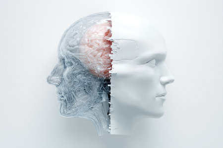 A sculptural brain split into two halves—one glossy white with gold accents, the other a dark circuit board with glowing red lights. This artistic rendering explores the duality between natural cognition and artificial intelligence.