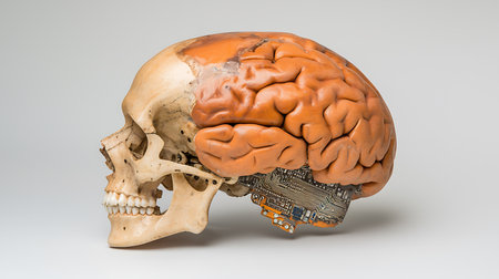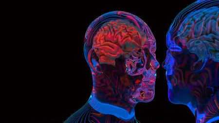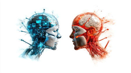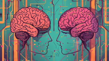 Two human brains facing each other in a cybernetic background. Perfect for technology, neuroscience, and futuristic design concepts.