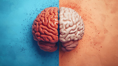 This artwork depicts a creative representation of a brain split into two contrasting colors, showcasing the different aspects of thinking and emotions, ideal for psychology and creativity themes.
