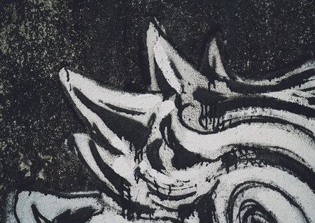 Close-up of person creepy animal like eyes with face partially painted in monochromatic palette, suggesting sense of fear and distress.