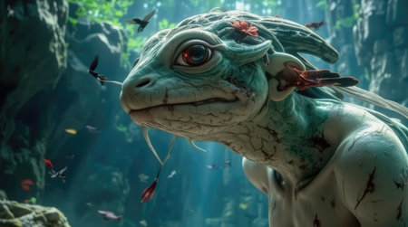A fierce fantasy creature with sharp features and intense eyes, captured in a dimly lit setting, showing intricate details in its skin texture.
