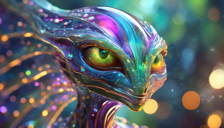 AI generated image showing the portrait of an iridescent alien creature in blurry back