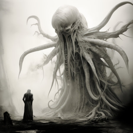 an old man gazes at a massive ogre, adorned with horns and long tentacles, in a captivating black and white image. the mist-like style adds an eerie touch to the scene, while the tangled nests and bulbous features of the ogre create a sense of otherworldly sci-fi realism. this captivating photograph, captured in the cryengine, has the essence of an associated press photo. ai generated