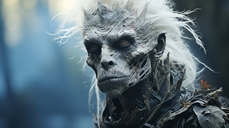 a person wearing a white mask and white hair stands in the woods, depicted in a cinematic style using cinema4d. the image showcases a manticore theme with dark silver and blue tones. the close-up shot captures the essence of frostpunk and junglepunk aesthetics, resulting in an energy-filled illustration. ai generated