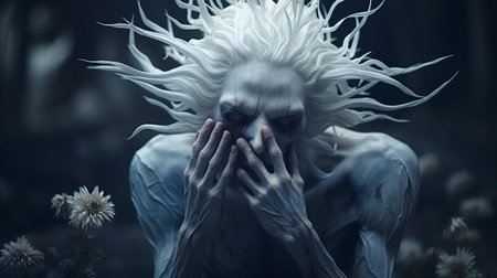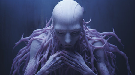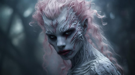 A close up of a person with an alien face and hair, AI
