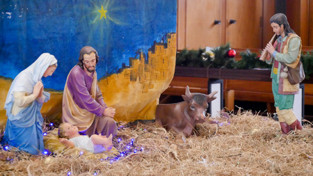 Nativity scene. Christmas crib. Holy family with baby Jesus. Catholic church. France.