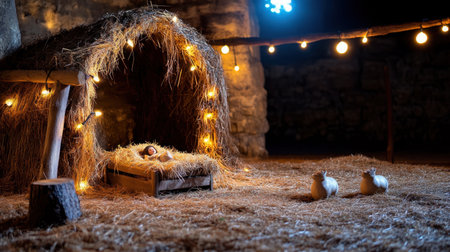 Nativity display with hay-filled manger and serene atmosphere of sacred Christmas night
