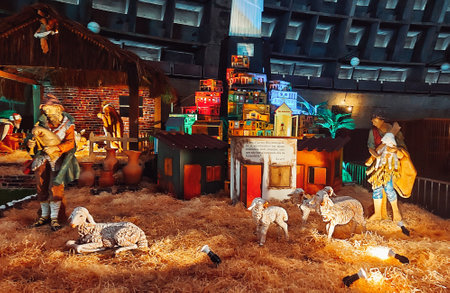 IMOLA (BO),ITALY - DECEMBER 27, 2017: lights are enlightening artistic crib in the 7th edition of the Nativity Scenes Exhibition in the Convent of the Observance