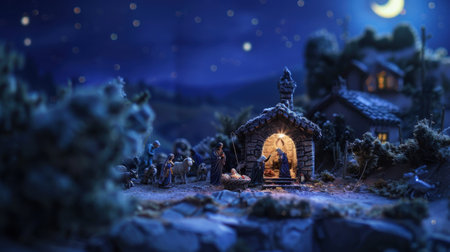 Peaceful nativity with glowing manger nestled in tranquil blue night of Bethlehem